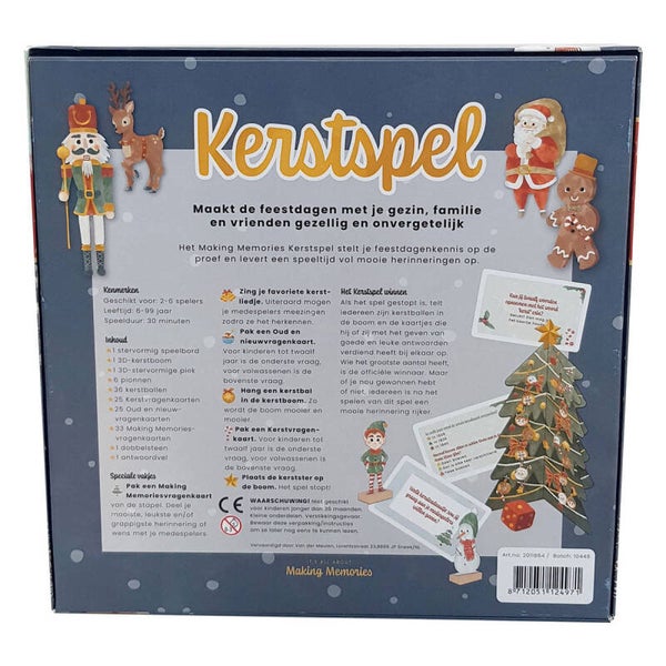 Dat kerstmis voor velen draait om familie en vrienden is geen verrassing. Dat je gezamelijk zowel een competitef als diepgaand spel kunt spelen is nieuw. Het doel van het kerstspel is om zeventig vakjes te bewandelen en onderweg zo veel mogelijk kerstballen in de 3D-kerstboom te hangen en vragenkaartjes te verzamelen. De vragen testen je kerst- en nieuwjaarskennis en zijn voor kinderen eenvoudig en voor volwassen wat ingewikkelder. Kom je op een vakje waar een Making Memories-vraag mag pakken, dan beantwoord je vragen zoals: Wat is je dierbaarste kerstherinnering? of Met wie zou jij het liefst kerst willen vieren? Die brengen de leukste, grappigste en bijzonderste kerstherinneringen naar boven. Zo leer je elkaar nóg beter kennen!