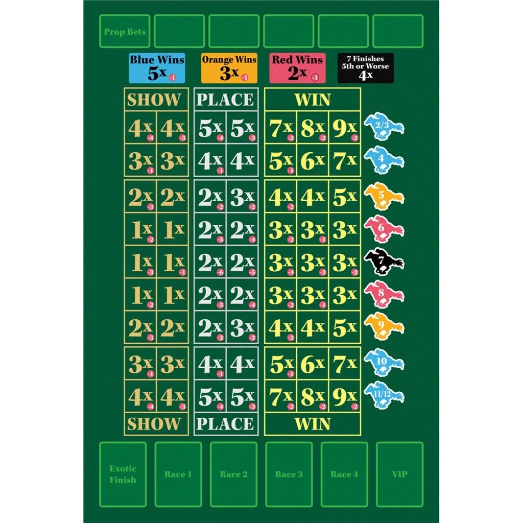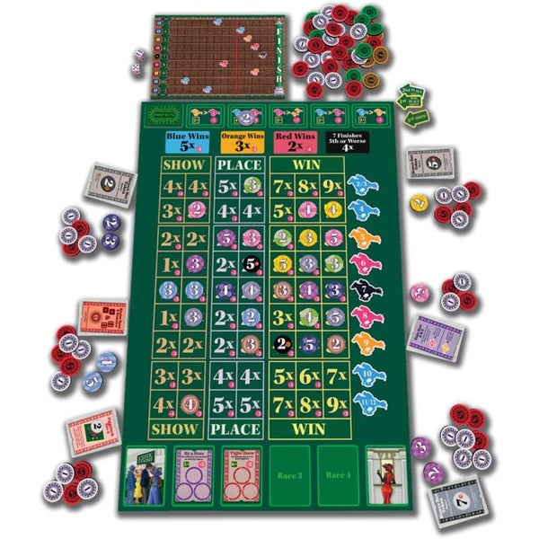 Inhoud: 1 spelregelboek, 32 VIP-kaarten (standaard), 28 Prop Bet-kaarten (mini), 5 Exotische Finish Kaarten (standaard), 1 Race Baan spelbord, 1 Inzetbord, 143 Geld Fiche Tokens, 52 Inzetmunten, 6 Huis Inzet Tokens, 2 6-zijdige dobbelstenen, 9 Houten Paardjes, 8 Win Fiches, Plaatsing Fiches, Show Fiches